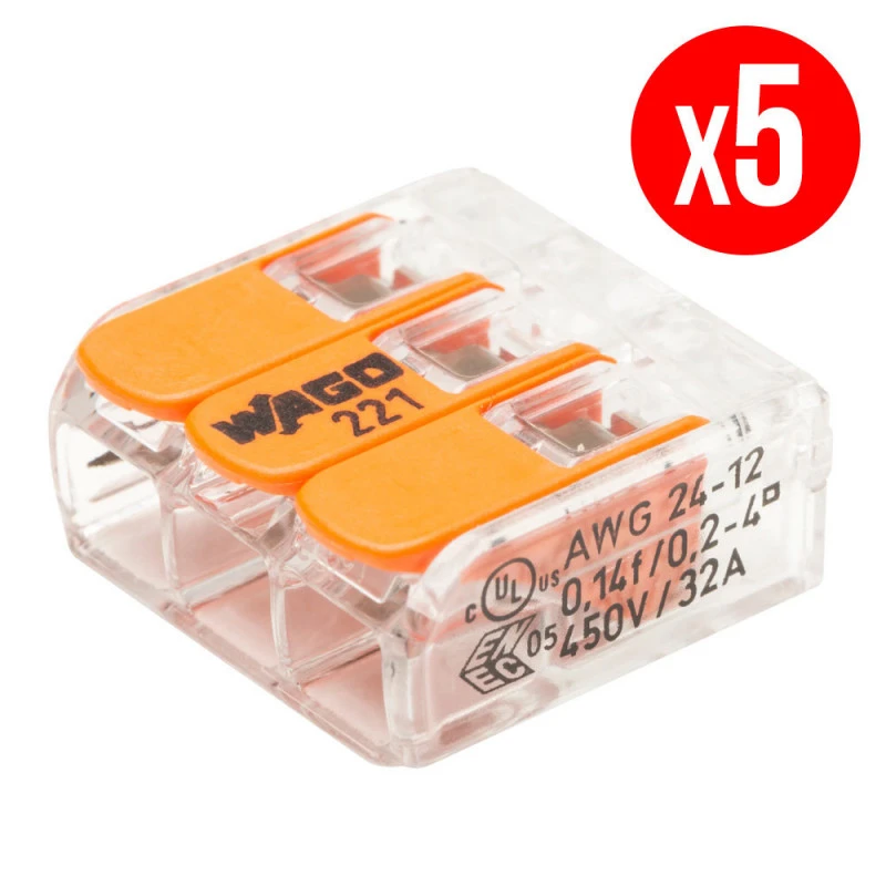 Pack de 5 bornes de connexion rapide à levier WAGO 3 entrées fil souple et rigide – S221