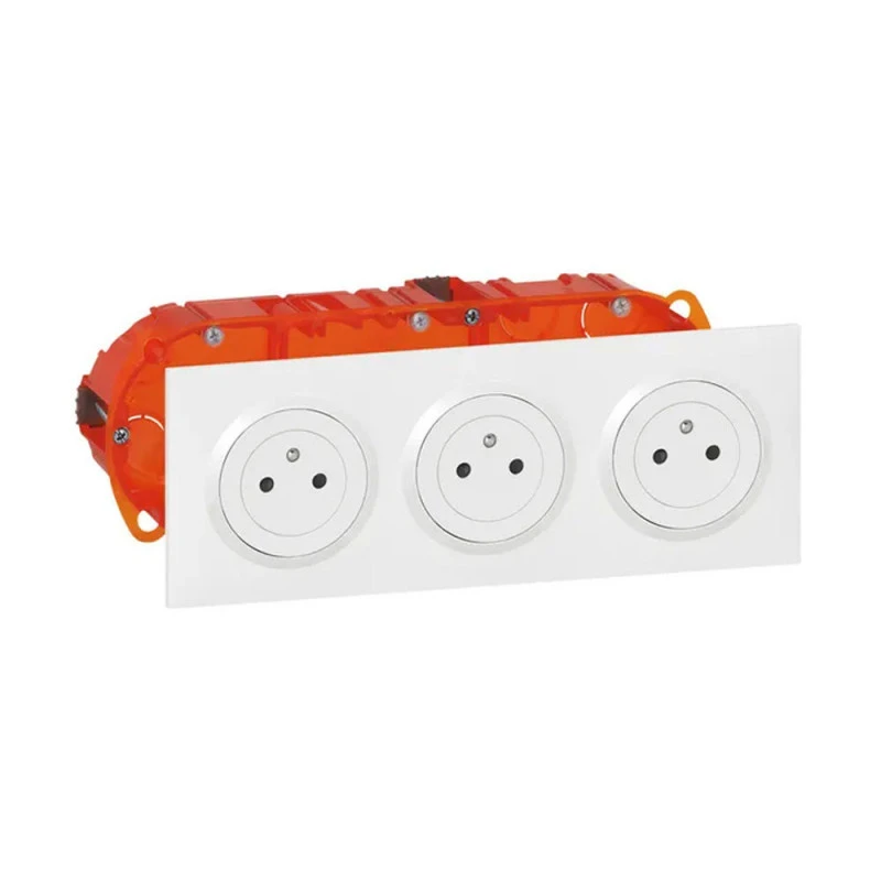 Ce kit triple prise de courant Dooxie, de la marque Legrand, est un ensemble de mécanismes prêt à être posé pour le branchement de plusieurs appareils électriques dans un seul endroit.